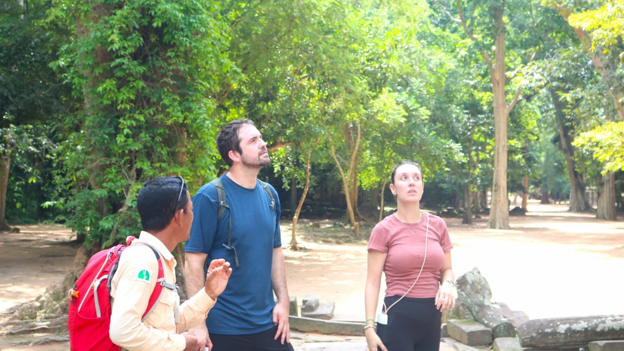 After lunch, Pedal through the shaded paths to Angkor Thom, the last great capital of the Khmer Empire. Enter through the lesser-known Eastern Gate for a quieter and unique experience. Explore the enigmatic Bayon Temple, known for its towering faces and intricate carvings. Your guide will help you uncover the stories behind the temple’s 54 towers and numerous serene stone faces.